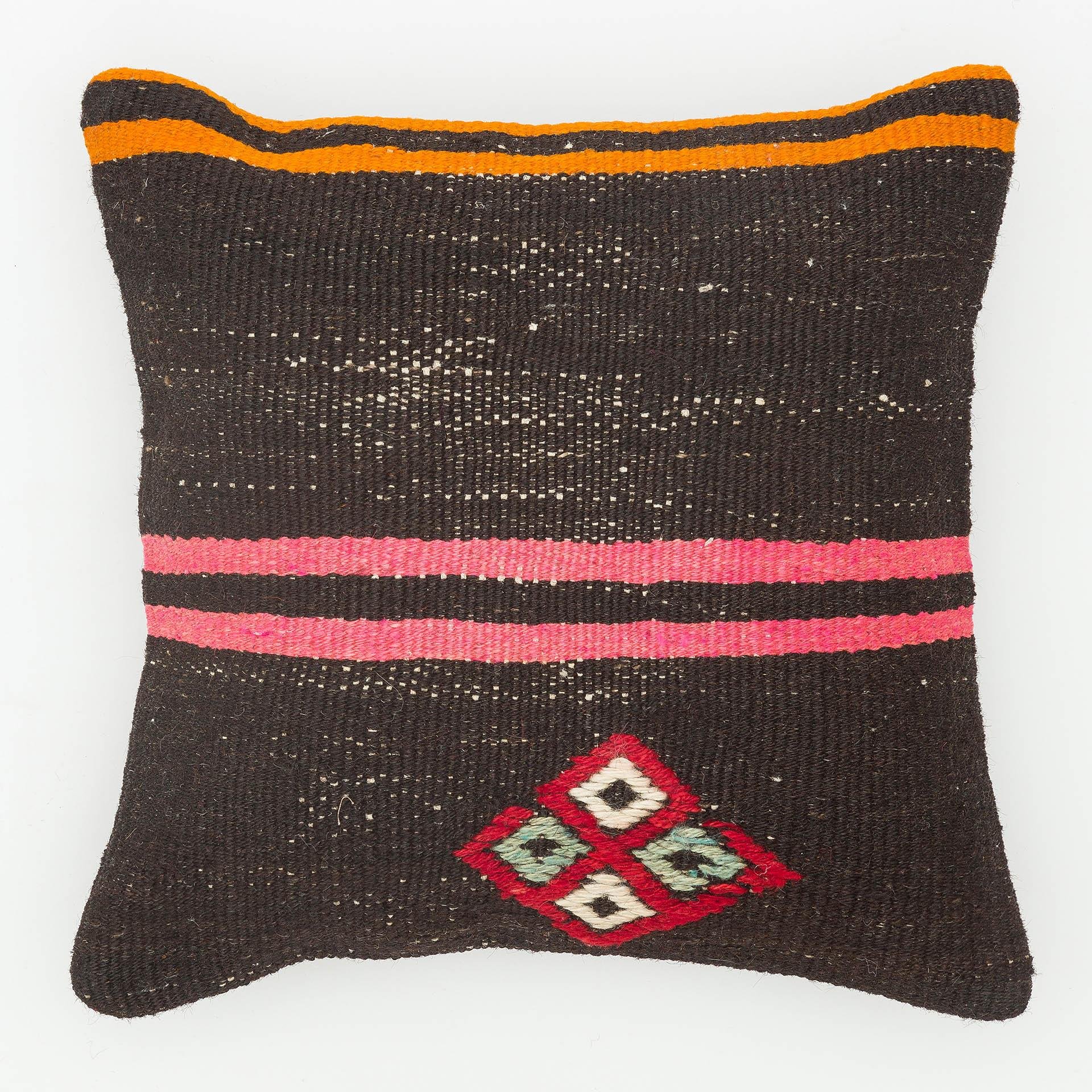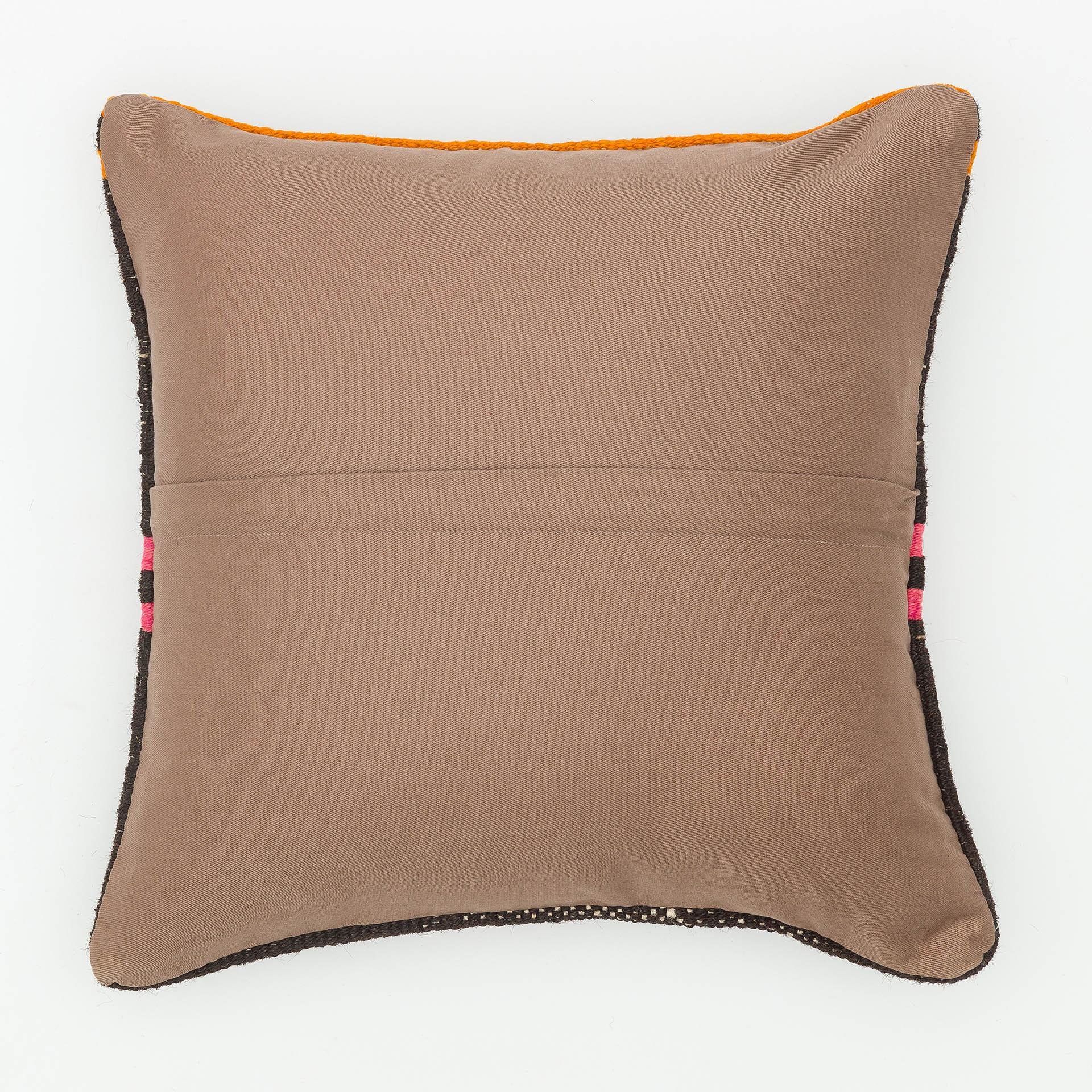 TURUNCU PEMBE ÇİZGİLİ EL DÜĞÜMLÜ SİYAH KEÇİ KILI YASTIK KILIFI (KR-13776)